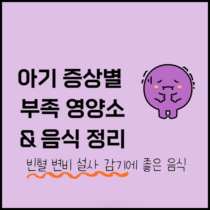 이 글에서는 아기에게 나타날 수 있는 여러 가지 증상(빈혈, 변비, 설사, 탈수, 미열, 감기 등)에 따라 부족할 수 있는 영양소와 급원 식품을 정리했습니다.