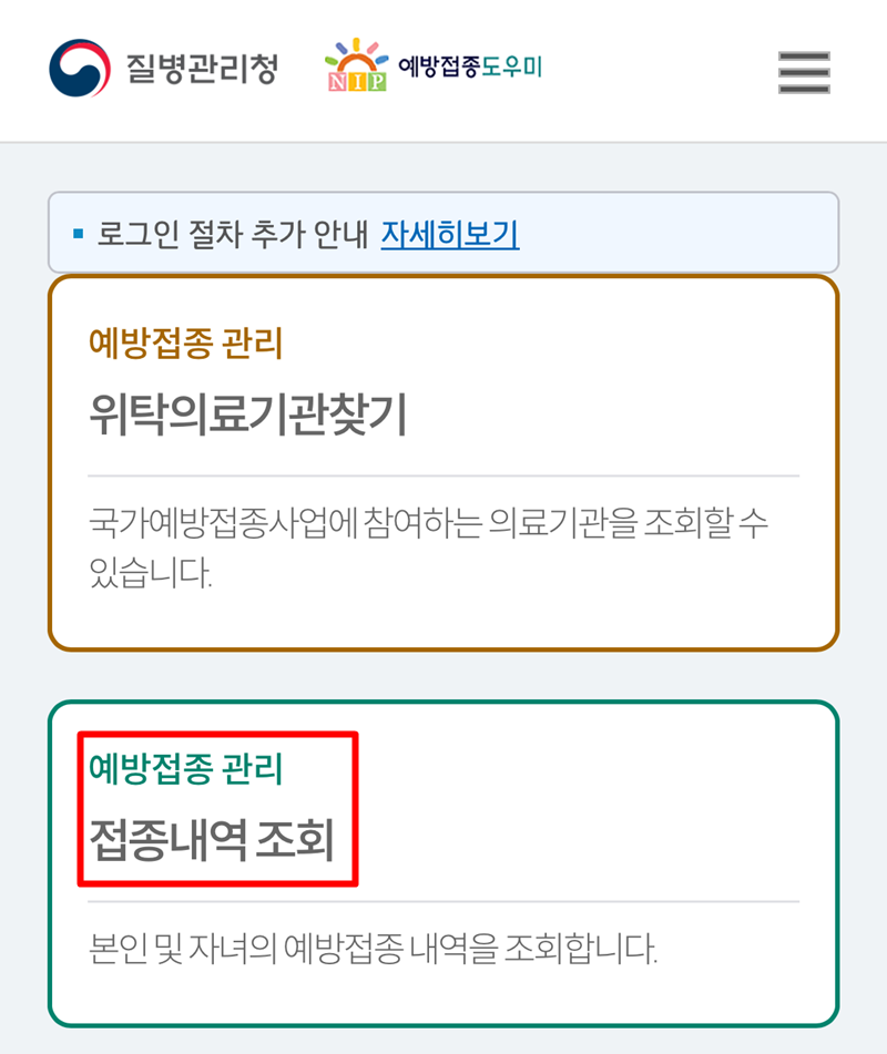 예방 접종 이력은 질병관리청 예방 접종 도우미 사이트에서 확인 가능합니다.